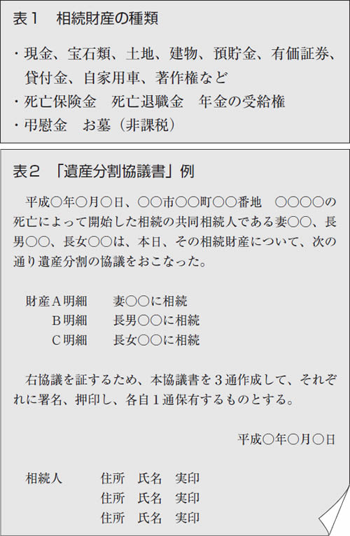話がまとまれば、「遺産分割協議書」(表2)を作成します。形式は問いませんが、財産明細と分割方法、日付、相続人全員の署名と実印での捺印が必要です。また、全員の印鑑証明書を添付します。