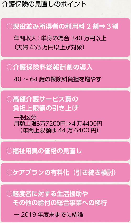 政府は昨年まで「利用料の一律2割負担化」「要介護2以下の福祉用具貸与の自己負担化」「要介護1・2の生活援助の自己負担化」「要介護2以下のその他のサービスの総合事業への移行」を検討していました(本誌昨年11月号)。