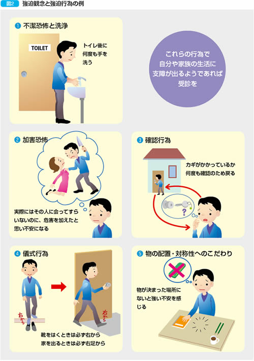 よくある強迫観念と強迫行為は、(1)不潔恐怖と洗浄、(2)加害恐怖、(3)確認行為、(4)儀式行為、(5)物の配置・対称性へのこだわりがあります(図2)。