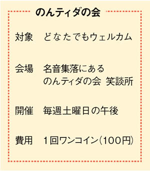 のんティダの会の活動は「楽しい」だけでなく、ひきこもりの予防にも役立っています。「週に一度は、ここに遊びにいらしてくださいね」と声をかけあい、常連さんの顔が見えないと、自宅にコーヒーやお菓子を届ける心遣いも。「これからも、和気あいあいと楽しく続けていけたら」と国副さん。南の島の暖かい気候に、気配りも心地よい居場所です。