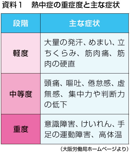 熱中症は重症度によって軽度、中等度、重度の3段階にわけられ(資料1)、中等度以上は医療機関への受診が必要とされています。