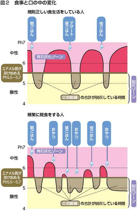 人間の自然治癒力の1つに唾液の力があります。一度物を食べると口の中の状態が酸性に傾きます。この時に、酸によって歯の表面のエナメル質が溶けて(脱灰)、虫歯になりやすくなります(図2)。