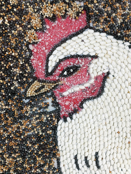 町内に2つある制作グループのうち、「山道弥生画保存会」の渋谷信一さんに話を伺いました。11月下旬から下絵を描き始め、毎日3?4人体制で15?20種類の種を張り付けるそう。「一番小さい種は緑肥用の大豆で、2?3mmしかありません。肌色の部分はメロンの種を使いますが、並べ方次第で表情が変わるので、結構難しいんですよ」。