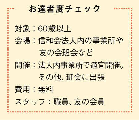 信和会(京都市左京区・東山区・山科区)では昨年から、地域のシニア向けに無料で体力や認知機能を計測する「お達者度チェック」を実施。「健康で長生きしたい」という住民の願いにこたえようと、専門性を生かしたサポートをしています。