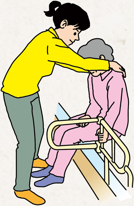 お辞儀をするように頭を下げると、体の重心がおしりから足へと移り、少ない力で立ち上がることができます。体が不安定な場合は手すりや壁につかまりながら立ちましょう。いきなり真上に立ち上がろうとすると膝や腰に負担がかかります。