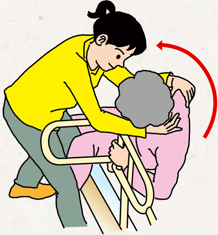 介助者は両足を前後に大きく開いて腰を落とし、両腕を腰に回す。介助される人の両腕を、介助者の肩に回してもらう。介助者は引くように体重を足に移動させる。