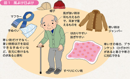 車いすを使う場合、体を動かす介助者は暑く感じがちですが、車いすに乗っている人は座っているので、介助者よりも寒く感じます。また夏は、日差しを避けられず日焼けしてしまうこともあります。風や日差しは、膝掛けが1枚あるだけでも防げます。常に携帯していると便利でしょう(図1)。