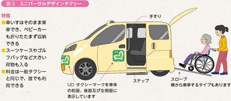 最近ではユニバーサルデザイン(UD)タクシーも増えてきました(図2)。UDタクシーはステップや手すりが付いていたり、車いすに乗ったまま後部のスロープからの乗降が可能です。介助者にとっても、移乗での転倒リスクが減るなど、外出におけるハードルが低くなります。