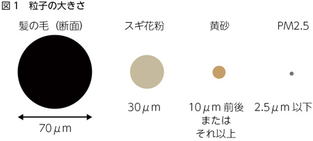 直径2.5μm以下の非常に小さな粒子のこと。1μm(マイクロメートル)は1mmの1000分の1の長さです(図1)。