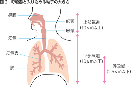 花粉や黄砂は大きすぎるので、喉より奥には入り込めません。しかし、PM2.5は粒子が小さいので、肺の奥深くに入り、呼吸器系や循環器系の病気を悪化させます(図2)。