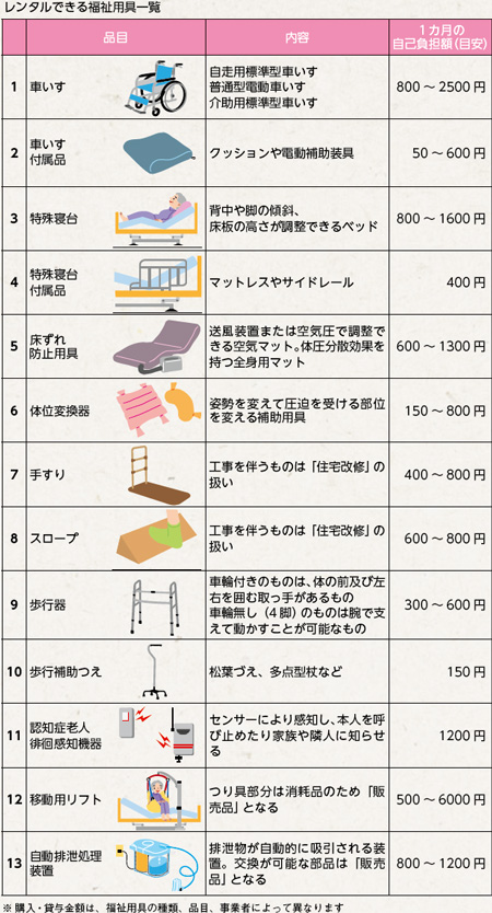 介護保険で福祉用具を貸し出すサービスです。対象となる用具は表の通りです(介護度に応じた支給限度額の範囲内で利用料の1割が自己負担)。