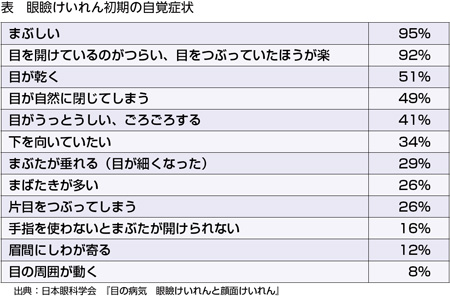 眼瞼けいれんは、通常両目に起こりますが、まれに左右差があります。初期の自覚症状は、「まぶしい」「まばたきが多い」「目が乾く」などです(表)。