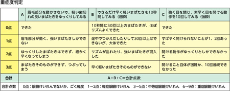 眼瞼けいれんの症状は、表のように多彩です。「目が自然に閉じてしまう」「手指を使わないとまぶたが開けられない」という訴えであれば、容易に診断できます。