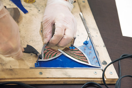 2月26日の夕方5時過ぎ、城北病院併設の城北クリニック多目的室に職員と友の会員ら15人が集まりました。この日は「ステンドグラス部」の“体験入部”の日。部員はそれぞれガラスを削ったり枠にはめ込んだりと、制作に没頭しています。