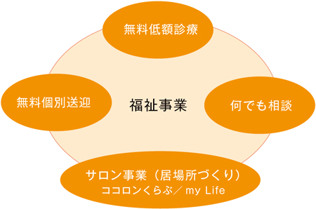 同診療所は医療・介護・保健(健診など)の3つの事業に加えて、何でも相談やサロンなどを第4の事業「福祉事業」と位置づけて活動しています。