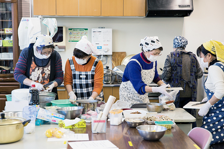 毎月第3火曜日は、ココロンくらぶの開催日。組合員ボランティアが中心となり、栄養満点の食事を一食300円で提供しています(中学生以下と75歳以上は無料)。取材した日のメニューはちらし寿司や筑前煮、茶碗蒸しなど6品。ボランティア7人で、忙しく調理していました。