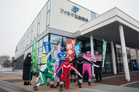 3月8日午後4時の弘前市は気温0℃前後。背後に雪原を控えた道路に並ぶのは、5人の“ファルマレンジャー”と揃いのコートを羽織った8人の職員たち。毎週金曜日、「ファルマ」の各薬局前で行われるスタンディングです。