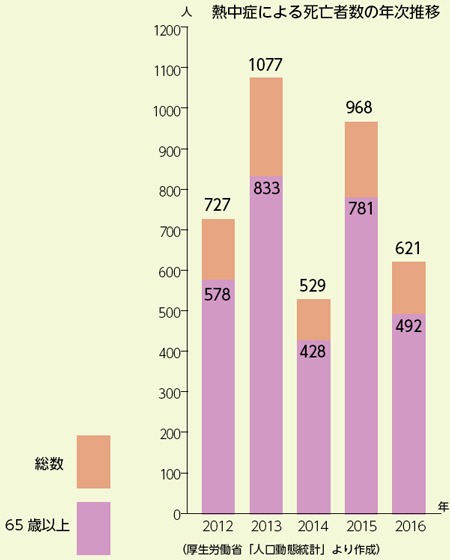 2016年には621人が熱中症で亡くなっており、そのうち65歳以上の高齢者が492人(約8割)を占めています。年によっては死亡者が1000人を超えたこともありました。死亡者数が1731人に達した2010年は、「家(庭)=住宅、中庭、車庫など」が発生場所の45.8%を占めており、屋内やすぐに退避できる環境でも安心できないことを物語っています。