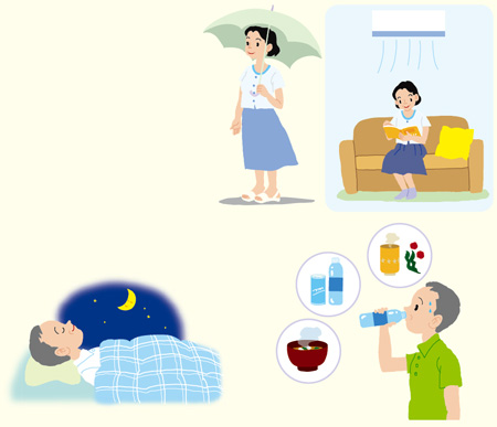 「レ=冷却、ス=水分補給、キュー=休息」です。具体的には暑いところを避けて、風通しの良い部屋や日陰に行くようにしたり、クーラーを上手に利用しましょう。服装も通気性の良い生地や形態を選び、日傘や帽子を使います。水分をこまめに補給し、休憩も十分に取ってください。