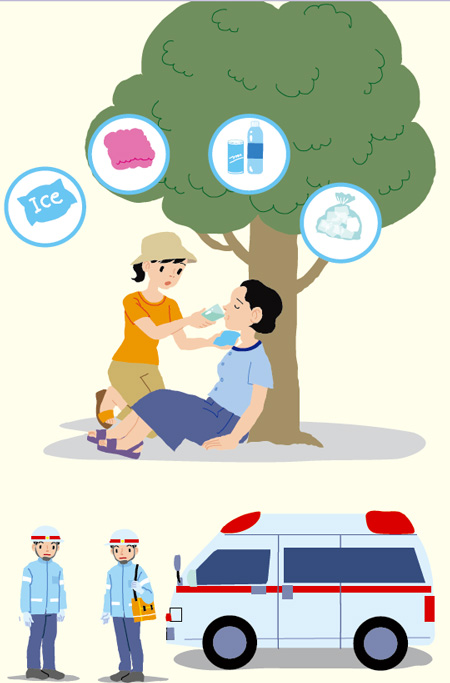レ=冷却 涼しい木陰で休ませる、室内なら窓を開ける。クーラーや扇風機をつける。服をゆるめ、ぬれタオルを体にかけてあおぐ。首の周りやわきの下、足の付け根を保冷材や氷で冷やす。