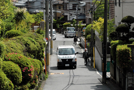 バスは午前10時に吉田病院を出発。普段は病院で患者さんの移動用に使っている小型バスを利用して、周辺の住宅街や駅を経由する約50分のコースを巡回します。住宅街の路地にもこまめに入り、何度かUターンしながら坂が多く狭い道を走り抜けます。