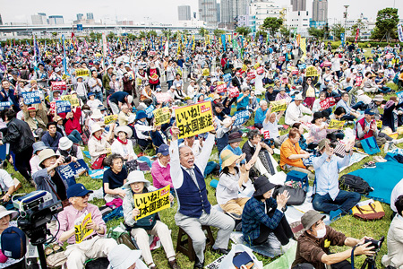 5月3日の憲法記念日に全国各地でいっせいに集会やデモ、宣伝などが行われました。東京臨海広域防災公園(江東区)には6万人が参加して「9条改憲NO! 平和といのちと人権を! 5・3憲法集会」が開催され、「いいね! 日本国憲法」「安倍政権退陣」とプラカードを掲げてアピールしました。
