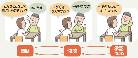 では実際に「話を聴く」とはどのようなことでしょうか。会話の基本は、「質問」「傾聴」「承認」の3つです。
