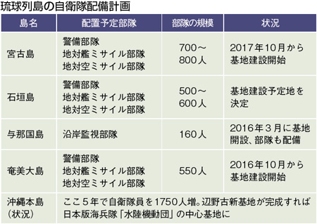 琉球列島のうち、台湾に最も近い与那国島の自衛隊基地は完成し、奄美大島は今年度中に完成予定。沖縄本島の自衛隊は1750人も増員した。与那国島、石垣島、宮古島、沖縄本島、奄美大島を結ぶ琉球弧の要塞化が進む。