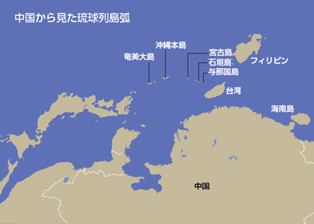 北朝鮮の脅威がマスコミをにぎわしているが、本当の狙いは中国の進出を阻む海峡封鎖。日本地図を逆にし中国から琉球列島弧を見れば一目瞭然だ(下図)。アメリカは海南島の中国軍基地から、原子力潜水艦が太平洋に出ることを恐れている。日本政府は自国のためでなく、アメリカの要請による「中国封じ込め」政策に沿って軍拡している。