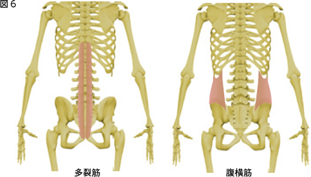 腰椎を支える筋肉は腹横筋や多裂筋など身体の深部にある筋肉、いわゆる「体幹」と呼ばれるものです(図6)。