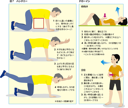 腹横筋を鍛える運動「ドローイン」を紹介します。これはお腹をへこませる運動として聞いたことがあるかもしれません。多裂筋を鍛える「ハンドニー」もあわせて紹介します。腰痛を予防するためにも、筋肉による自前のコルセットをつくりましょう(図7)。