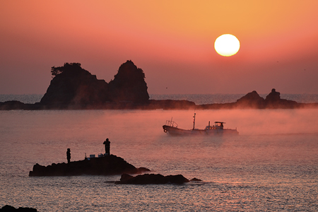 町の東側の田原海岸では、しんと冷え込む早朝に海霧が発生し幻想的な光景が広がる(南紀串本観光協会提供)