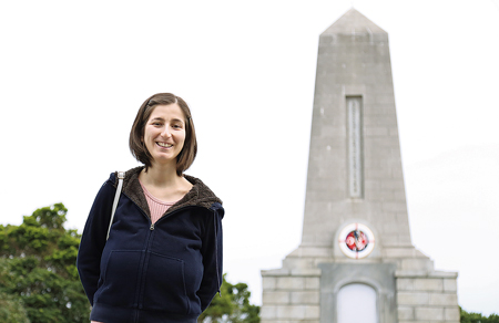 伊藤さんと、記念館の近くに建つトルコ軍艦遭難慰霊碑