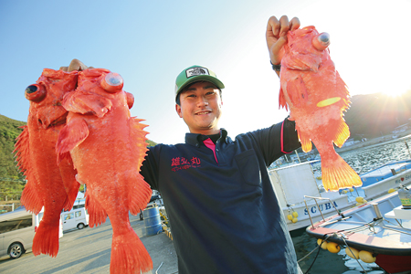 ちょうど釣り船が戻ってきたので獲れた魚を見せてもらうと、真っ赤なアコウダイが17匹! 1600mも釣り糸を垂らして獲る深海魚の一種だそうです。「これは鍋にすると旨いんすよ」と川端さんの甥の凌さん。他にも船釣りならカンパチなどの大物、磯釣りならグレ(メジナ)やイシダイなどが狙いどころだそうです。