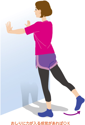 (1)両手を壁につけて右足を後ろに一歩下げ、つま先を床につける。