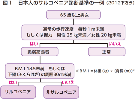 サルコペニアの診断は、歩行速度と握力、筋肉量を勘案して行います。日本人の診断基準の一例を紹介します(図1)。