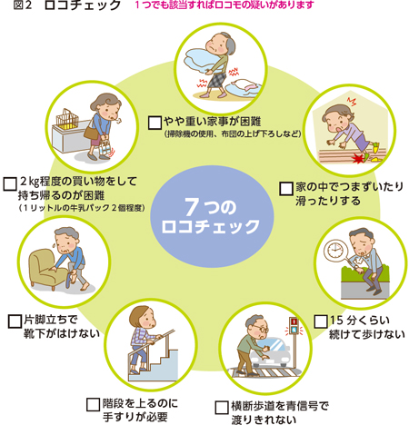 「ロコチェック」(図2)で1つでも該当する項目があれば、ロコモが始まっている可能性があります。さらに詳しい診断には「立ち上がりテスト」「2ステップテスト」「25項目の質問」が用いられます。
