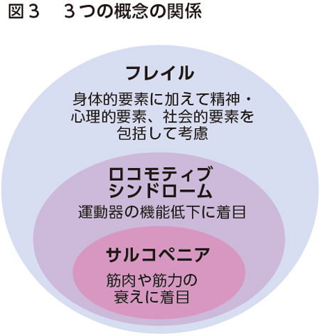 フレイルはサルコペニアやロコモのような身体的要素に加えて、認知症やうつなどの精神・心理的要素、ひとり暮らしや貧困などの社会的要素を包括した幅広い概念です(図3)。