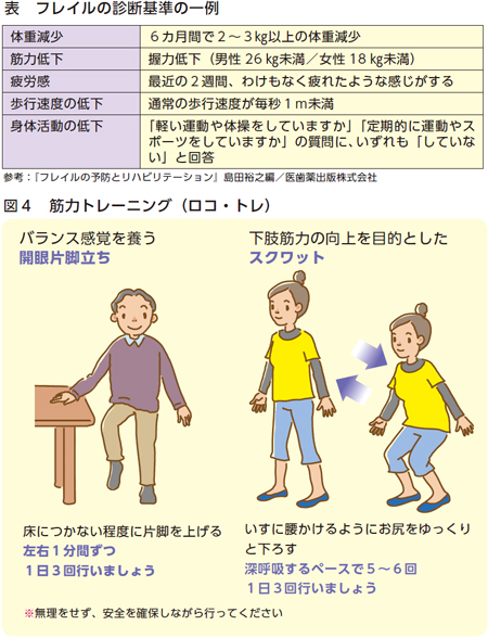 ウオーキングや自転車こぎなどの有酸素運動を週2回以上(1回20~30分以上)を目標に行います。さらに、無理のない程度(少しきついと感じられるぐらい)の筋力トレーニングを加えて、筋肉量を保ちます(図4)。
