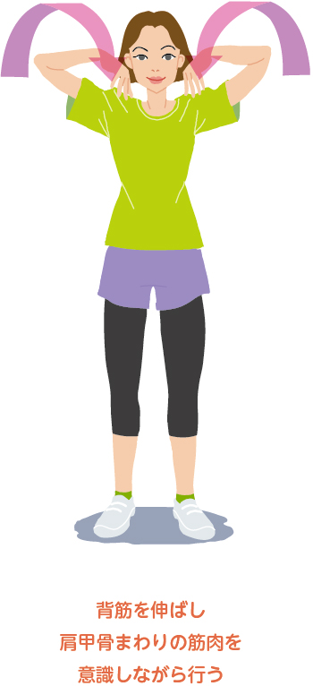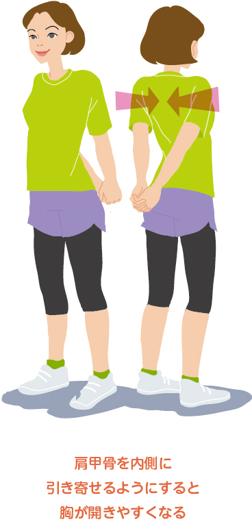 両手を腰の後ろで組み、胸を開く。10秒間ずつ1~2回行う。