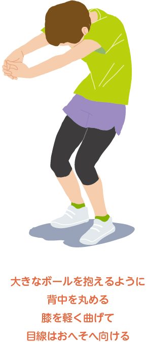 (2)息をはきながら手を前方へ伸ばし、背中を丸める。10秒間ずつ1~2回行う。