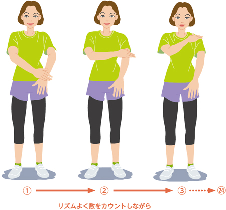 (1)右手で左手首→(2)右手で左肘→(3)右手で左肩→(4)左手で右手首→(5)左手で右肘→(6)左手で右肩→(上記を繰り返して(24)まで数える)