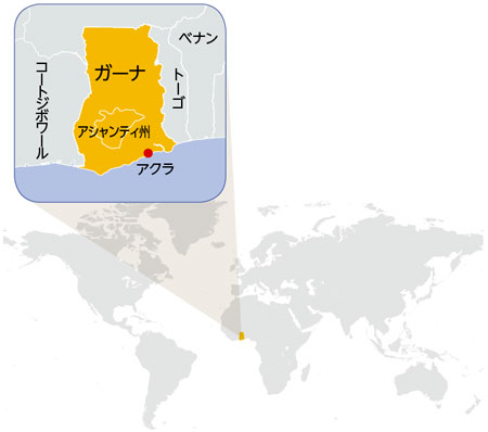西アフリカの小さな国、ガーナ。日本はガーナから、チョコレートの原料となるカカオ豆を最も多く輸入しています。都市部は少しずつ発展し、大きなビルやショッピングモールも見受けられるようになりました。アフリカ諸国の中では教育水準が高く、民主主義が根づいている国として知られていますが、都市部と比較して農村部はいまだに大きな格差の問題があります。