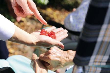 この日は天気もよかったので、みんなで散歩に行くことに。千秋病院の庭にはさくらんぼの木があり、その実がちょうど食べ頃を迎えていた。取った実をその場で食べてみると、控えめな甘さがなんとも優しい。今しか味わえない季節の味覚に、「おいしいね」と笑顔が溢れた。