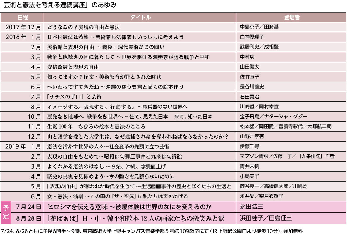2015年の安保法制をきっかけに立ち上がった「自由と平和のための東京藝術大学有志の会」。17年12月から月1回、東京都台東区の同大上野キャンパスで「芸術と憲法を考える連続講座」を開いています。5月14日には、1941年に美術教師らが治安維持法により弾圧された「生活図画事件」の被害者・菱谷良一さん(97歳)が登壇。“時代の証言”を聞いた若い世代の受け止めは? 参加した4人が憲法について語り合いました。