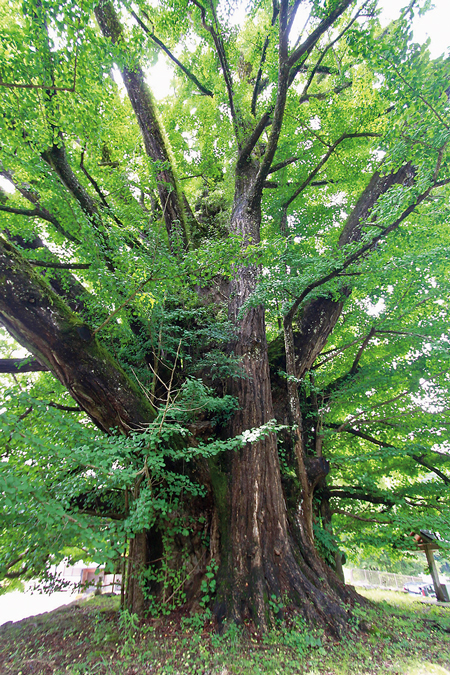 「ちちこぶさん」の名で親しまれる国指定文化財の大イチョウ。枝のこぶを煎じて飲めば母乳の出がよくなるという