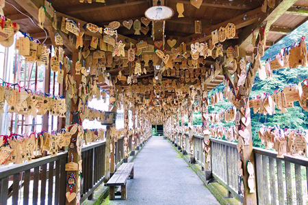 杖立川にかかる屋根のついた紅葉橋には、絵馬ならぬ鯉の形をした「絵鯉」がたくさん吊るされています。これは橋のたもとに店を構える「ふるや工房」の店主、高村孝志さんのおもてなしの心が生み出したもの。