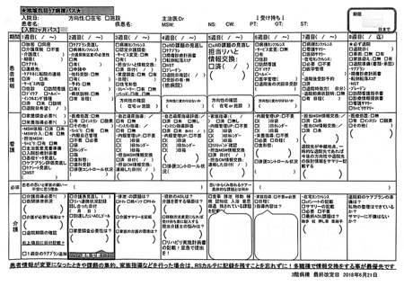 連携パスには病状をはじめ自宅の環境や食事・排泄・入浴の課題、家族の介護力など項目ごとにチェックボックスがあり、課題とやり残しはないかなど、退院支援の進行状況を一目で確認できる。