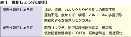 骨粗しょう症の原因は、大きく2つに分けられます(表1)。1つは加齢に伴って骨の代謝のバランスが悪くなることで起こる「原発性骨粗しょう症」です。もう1つは、何かしらの持病から骨粗しょう症を発症する「続発性骨粗しょう症」です。