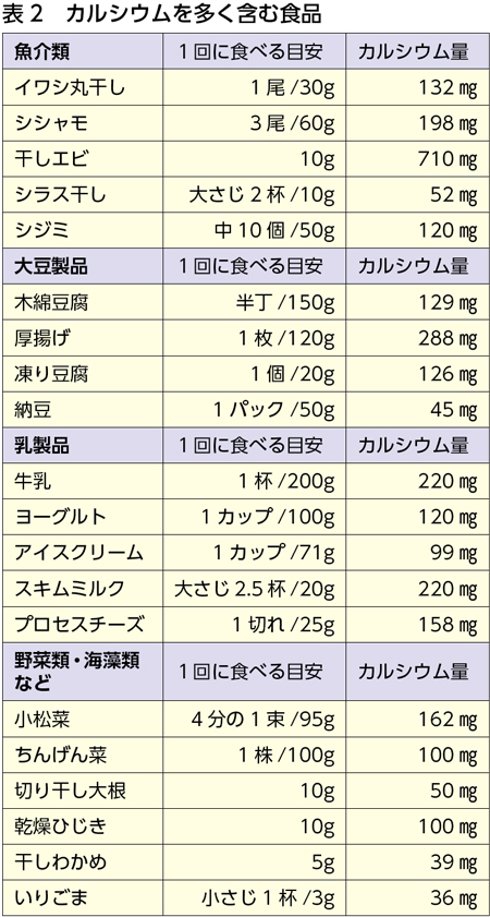 骨粗しょう症予防の基本は食事と運動です。特に日本人はカルシウムの摂取量が必要量に足りていない方が多く、意識的に摂取を心がけることが大事です。カルシウムは牛乳などの乳製品、豆腐や納豆などの大豆製品、骨ごと食べられる小魚、ひじき・わかめ・のりなどの海藻類、小松菜やちんげん菜などの緑黄色野菜に含まれます(表2)。